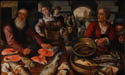 在佛兰德地区(Flanders),鱼市场景画作的流行部分源于渔业日益增长的重要性,尤其在从敦刻尔克(Dunkirk)到斯海弗宁恩(Scheveningen)的沿海中心地带。这类画作因而象征着收藏者的生计来源与财富根基。随着时间推移,市集与厨房场景中充斥着愈发露骨的轻色内容与不-雅双关 ... ...这些著作中屡屡将饮食与情-欲相联系,同时警示人们警惕各类感官欲望,倡导节制之道。