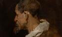 在这幅画板中间的三角形核心区域,凡·戴克(van Dyck)描绘了一位瘦削老人的侧面头像 --- 确切地说,是从半后方视角捕捉的轮廓。这可能是原本包含多个头像的画板残片。后世画家将其不规则形状改造成竖长方形,并添上了衣物与深色背景。模特身份对凡·戴克(van Dyck)毫无意义,他关注的是人物姿态以及光线在脸部与颈部肌肉上的流动效果。笔触精炼而富有力量,展现出敏锐的观察力。透明色层与不透明色块交替铺陈,光影折射处更添点睛之笔。褶皱的白色领口为这首以灰、赭、棕色调谱写的奏鸣曲画上终章。