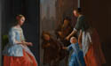 在荷兰上流社会宅邸的门厅里,两个世界激烈碰撞。画家雅各布·奥赫特维尔特(Jacob Ochtervelt)将身着鲜红与亮蓝的富贵家庭,与门外穿着暗褐色衣衫的乞丐形成鲜明对比。这种场景设置正是奥赫特维尔特(Ochtervelt)的标志性手法,他被誉为“门厅画”(entrance hall painting)流派的开创者。此空间旨在探索看似对立的阶层间普遍存在的人性联结。画面中,母亲正教导孩子向勤劳的乐师们施舍钱币。