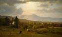乔治·英尼斯(George Inness)的《卡茨基尔山脉》(Catskill Mountains)描绘了一片被人类活动驯服的土地。画面中的教-堂、精心耕作的田地以及右侧的干草堆,都以英尼斯(Inness)早期作品典型的精细笔触勾勒。尽管艺术家在这幅作品中对色彩与光线的虔诚处理常被归因于他对伊曼纽尔·斯维登伯格(Emanuel Swedenborg)灵性思想的兴趣,但这也源于他对这片独特美国风光的由衷赞叹。19世纪中叶,卡茨基尔山脉是美国首屈一指的旅游胜地。得益于毗邻都市中心的地利与壮丽景致,这片山峦成为现代都市人逃离喧嚣的热门去处。