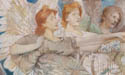 杜因(Dewing)这幅构图紧凑的小型作品描绘了四位歌唱天使,其灵感源自 14 世纪中世纪手稿中天使演奏乐器的形象。传统上天使常被描绘为弹奏弦乐器,人们认为其清雅音色能将心灵引向灵性境界。画中描绘的竖琴,正是与天籁之音联系最紧密的乐器。杜因(Dewing)通过光环与竖琴的连续环绕,营造出一种令人沉醉的天界旋律。