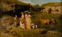 这幅画作开启了库尔贝(Courbet)以女性生活为主题的系列创作,描绘了他的三位姐妹——泽莉(Zélie)、朱丽叶(Juliette)和佐伊(Zoé) --- 在故乡奥尔南(Ornans)附近的小山谷“康穆纳尔”(Communal)中漫步的场景。其中一位女孩正向年轻的牧牛人施舍。库尔贝(Courbet)曾对这幅作品寄予厚望,但1852年沙龙展上,评论家们却斥之为粗俗笨拙。他们痛斥模特粗犷的相貌与乡土气息浓厚的服饰,嘲笑画中“滑稽”的小狗与牛群,更指责作品整体缺乏统一性 --- 包括传统透视法与比例尺度的运用。