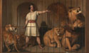艾萨克·范·安伯格(Isaac Van Amburgh,1805–1865)是美国驯狮师,曾在伦敦舞台大受欢迎。1838年维多利亚女王(Queen Victoria)至少 6 次观看其表演,其中一次更留下来观摩野兽喂食。此肖像画由威灵顿公爵(Duke of Wellington)(滑铁卢战役中击败拿破仑之人)委托创作。公爵委托创作时,特意指出《圣经·创世记》中上帝赋予人类统治万物的经文,并要求将该段落以某种形式铭刻于画作。兰德塞尔(Landseer)后来评论说,正因如此,这幅画对他而言是“神圣题材”。此画重现了但以理(Daniel)入狮穴的传统题材,但维多利亚时代的观众或许为范·安伯格(Van Amburgh)的勇气所折服,而当代观众面对笼中动物的囚禁状态,则更可能心生矛盾。